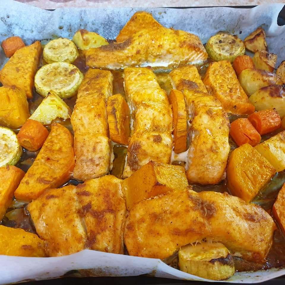 סלמון עם ירקות בתנור ותבשיל פסטה עם עדשים